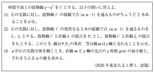 [B]放物線の基礎的総合問題(2026年東北大文1理1)