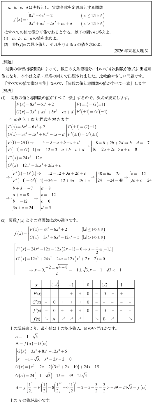 [B]4次関数の係数決定と最小値の問題(2026年東北大理3)