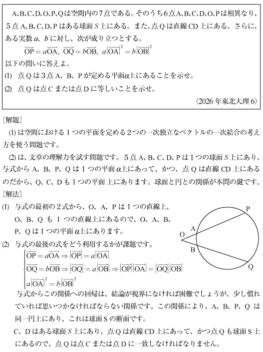 [C]球面上と平面上の点の所属の問題(2026年東北大理6)