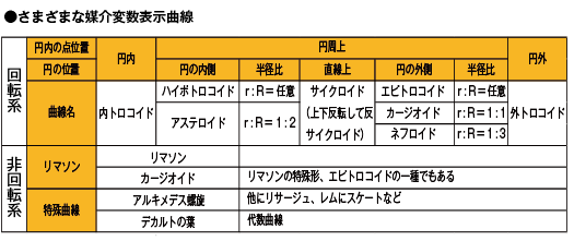 媒介変数表示曲線の名称は横文字のオンパレードで、とっつきにくいのですが、さまざまな特徴で分類して表にしてみました。「回転系」は円が転がる運動で生成されるもの、「非回転系」は極座標関数など、回転運動に基づかないものです。リマソンは非回転系ですが、その特殊形がカージオイドとなり回転系へ接続します。