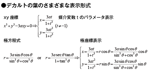 平面上の曲線を (r, θ) を用いて表す座標を極座標といい、F(r, θ)=0で表される方程式を,その曲線の 極方程式 といいます。 比較には、次に示す「デカルトの(正)葉」のさまざまな表示形式が適しています。