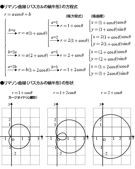 次に示すのは一般的に「リマソン曲線」と呼ばれるもので、極方程式が比較的簡単なので、入試問題によく取り上げられる主題です。曲線が極方程式で与えられている場合、面積、回転体体積や弧長積分は、極座標に変換して計算しますが、面積だけは極方程式専用の計算公式があります。