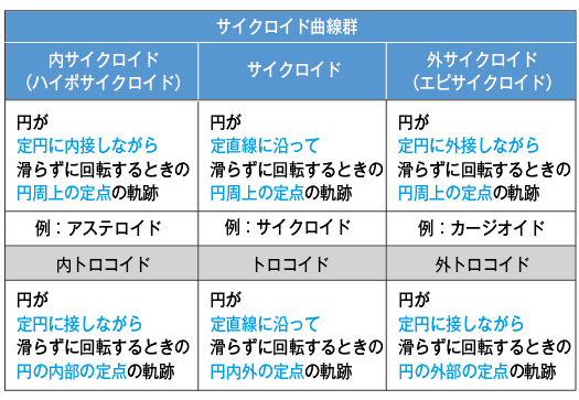 動円が滑らずに回転する場合とがあり、それぞれ定点が円周上にある場合と円の内外にある場合があり、それぞれ次のようにいろいろな名前で呼ばれます。