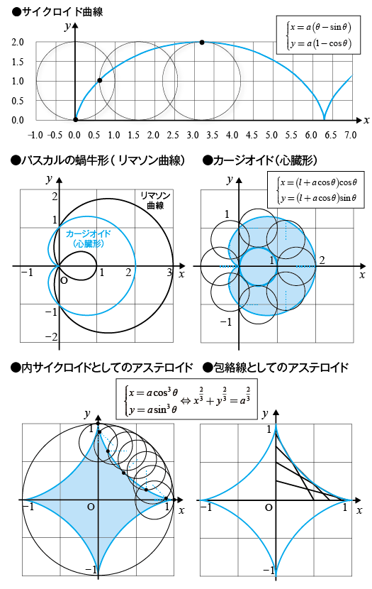 「回転系」には、定円の内外を動円が滑らずに回転する場合と、直線の上下を