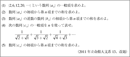 [A]階差数列・分数数列の計算問題(2011年立命館大文系13)[B]オイラーの公式を背景とする微積分問題(2023年立命館大理3)