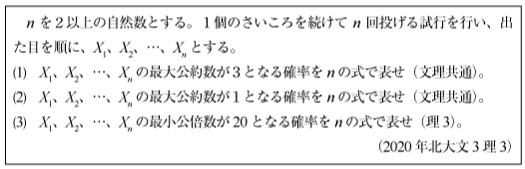[B]さいころの目の最大公約数・最小公倍数の問題(2020年北大文3理3)
