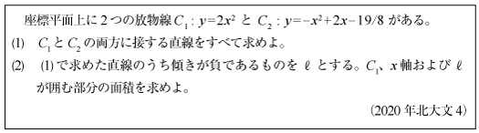 [B]2つの放物線に接する接線と面積の問題(2020年北大文4)
